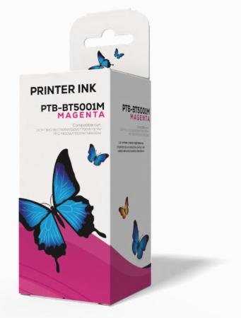 La BT5001M es una botella de tinta color magenta de alto rendimiento, fabricada por Brother para sus impresoras con sistema de tanque (Ink-Tank / tinta continua).
