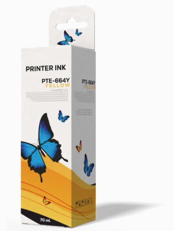 “El artículo con código PTE-664Y-70ML es una botella de tinta compatible (genérica) de color amarillo (Yellow) con una capacidad de 70 mililitros.