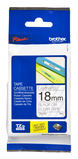 Etiqueta clara continua laminada Brother TZE141, de 18 mm de ancho x 8 mts de largo. Impresión en negro.