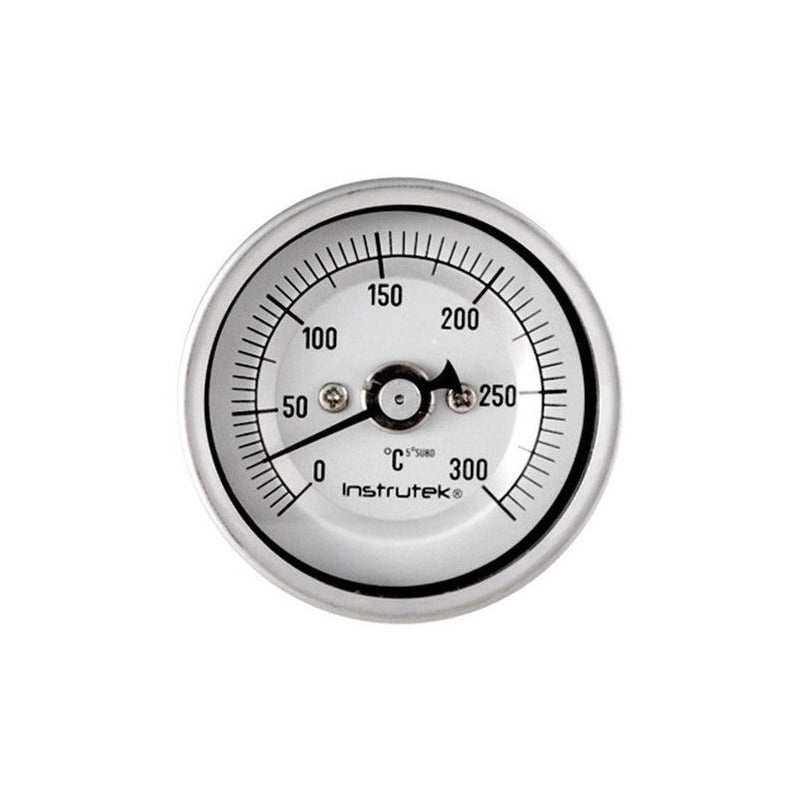 Termómetro bimetálico de acero inoxidable con tornillo recalibrador. Rango de 0 a 300, escala sencilla en grados Celsius. Carátula de 2″, conexión posterior de 1/4″ NPT, vástago 9”.