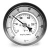 Termómetro bimetálico de acero inoxidable con tornillo recalibrador. Rango de -20 a 120, escala sencilla en grados Celsius. Carátula de 2″, conexión posterior de 1/4″ NPT, vástago 9”.