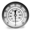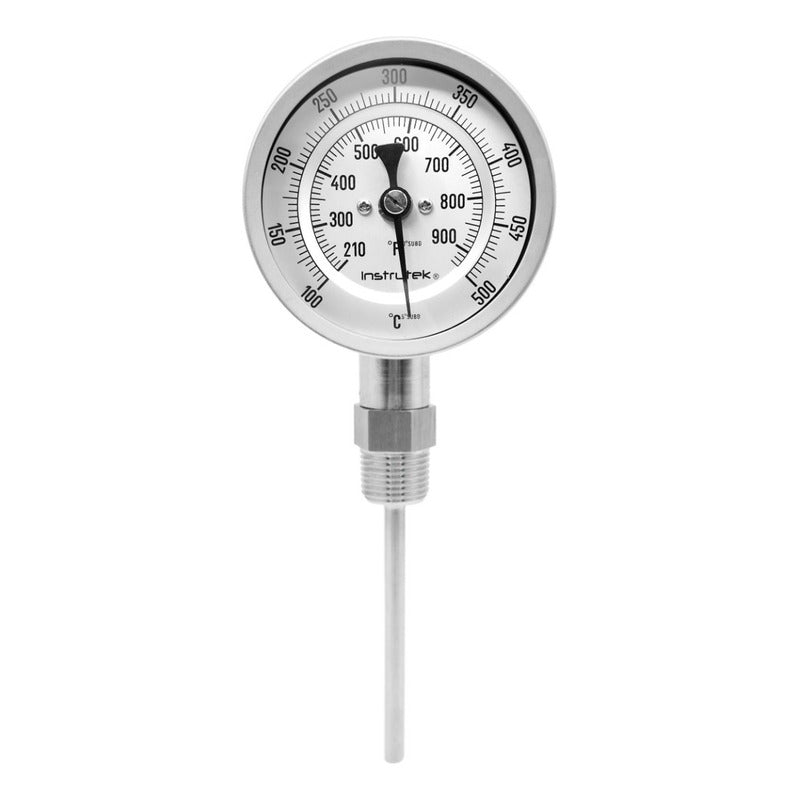 Termómetro bimetálico de acero inoxidable con tornillo recalibrador. Rango de 100 a 500, escala dual en grados Celsius y Fahrenheit. Carátula de 3″, conexión inferior de 1/2″ NPT, vástago 4”.
