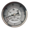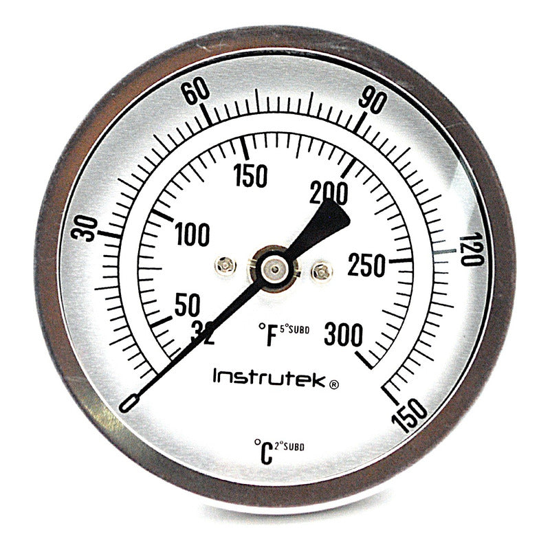 Termómetro bimetálico de acero inoxidable con tornillo recalibrador. Rango de 0 a 150, escala dual en grados Celsius y grados Fahrenheit. Carátula de 3″, conexión posterior de 1/2″ NPT, vástago 2.5”.