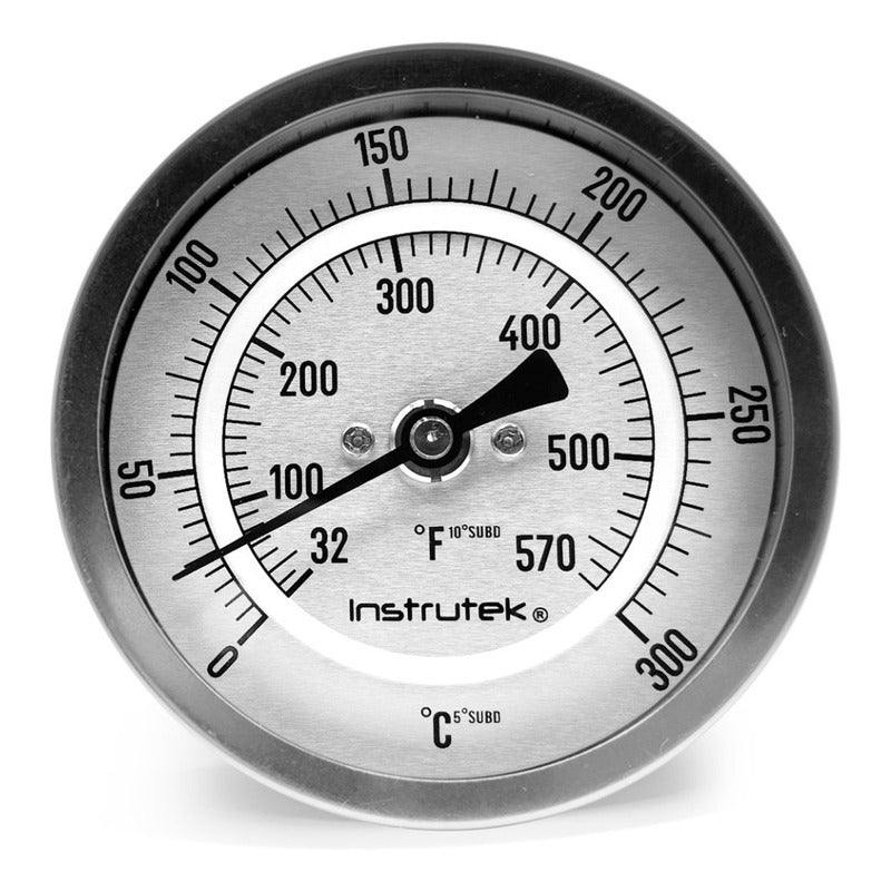 Termómetro bimetálico de acero inoxidable con tornillo recalibrador. Rango de 0 a 300, escala dual en grados Celsius y grados Fahrenheit. Carátula de 3″, conexión posterior de 1/2″ NPT, vástago 4”.