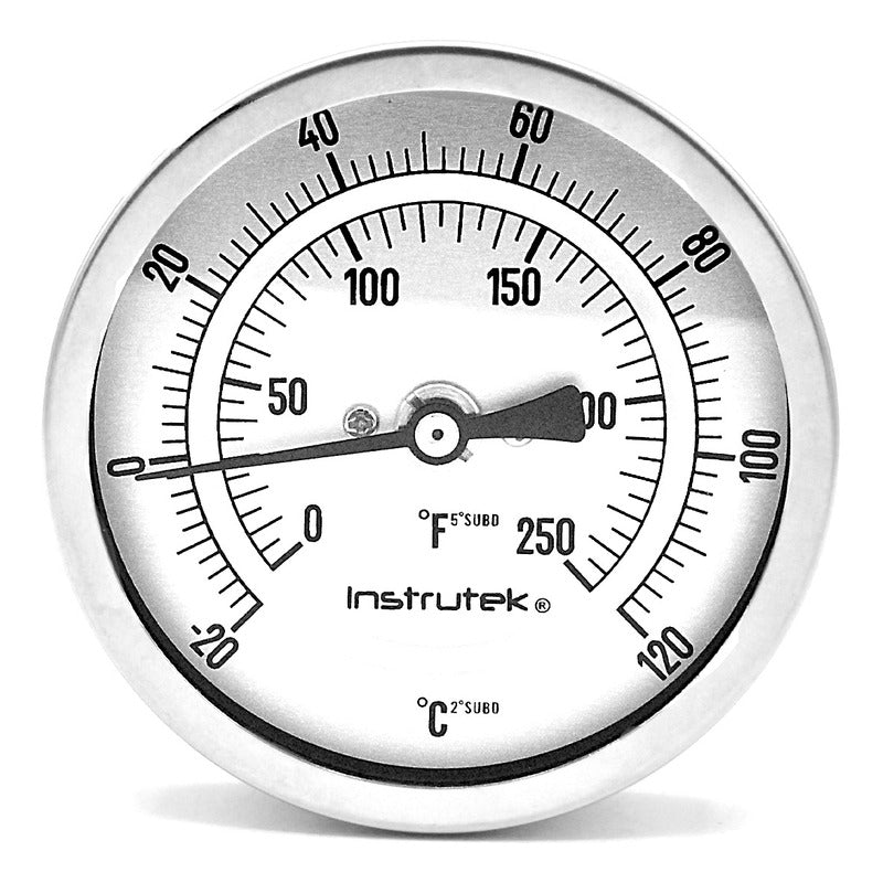 Termómetro bimetálico de acero inoxidable con tornillo recalibrador. Rango de -20 a 120, escala dual en grados Celsius y grados Fahrenheit. Carátula de 3″, conexión posterior de 1/2″ NPT, vástago 9”.