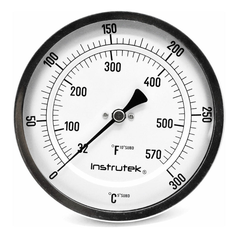 Termómetro bimetálico de acero inoxidable con tornillo re-calibrador. Rango de -20 a 120 celsius, escala dual en (Celsius y Fahrenheit). Carátula de 5 pulgadas, conexión posterior de 1/2″ NPT, vástago 4”.